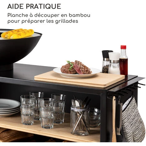 Le barbecue braséro blumfeldt Savage 2.0 Wide permet de créer une ambiance de jardin crépitante et d’agréables soirées barbecue sous les étoiles grâce à de nombreux espaces de rangement et à une planche à découper intégrée en bambou.