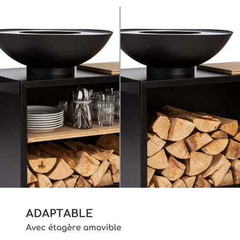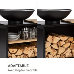 UN GRILL PRATIQUE ET PUISSANT : Ce brasero plancha est équipé d’un support de stockage sécurisé et d’une étagère amovible en bambou qui contiennent beaucoup de bois de chauffage pour se réchauffer confortablement lors des nuits fraîches.