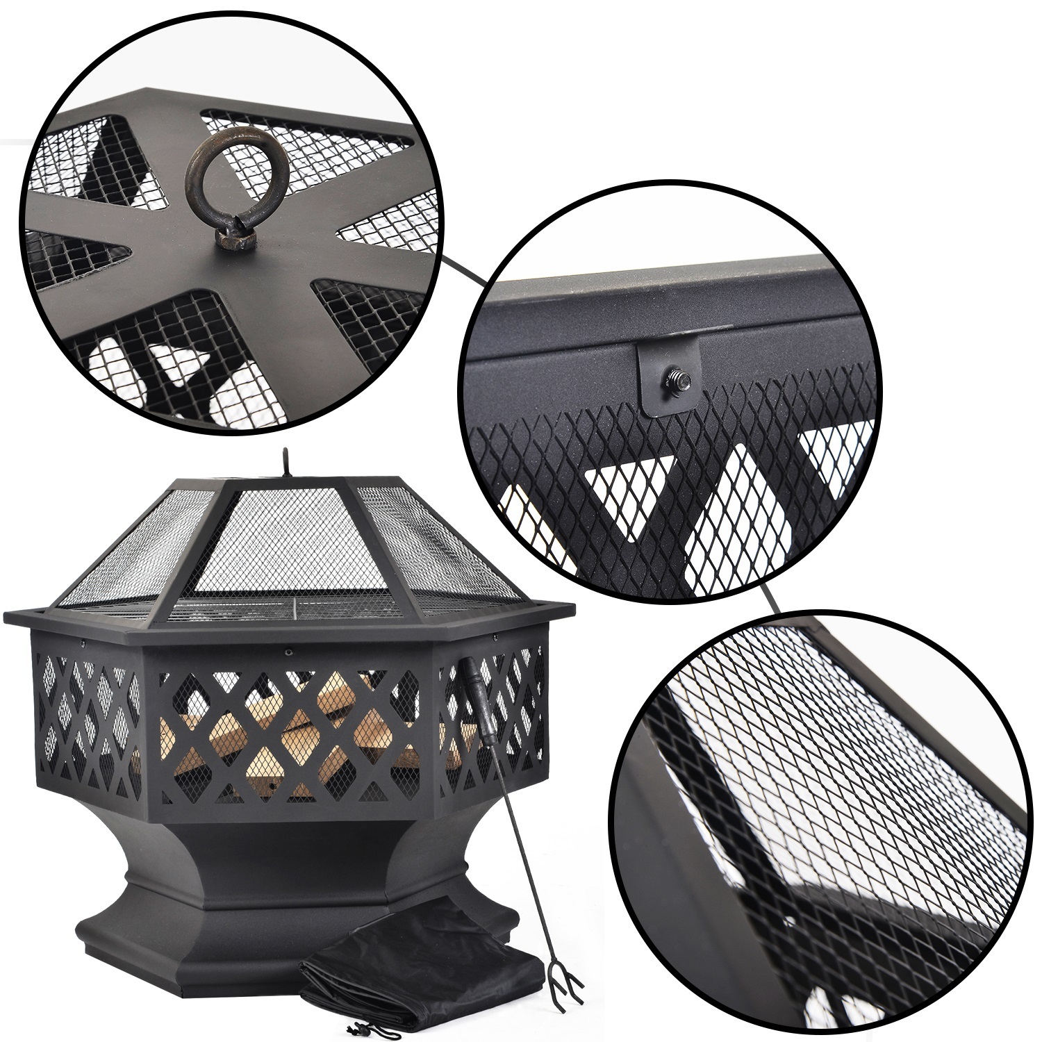 * SÛR ET GARANTI – Caractéristiques avec couvercle en filet pour éviter les braises brûlantes ; Le tisonnier peut être utilisé pour attiser le feu et retirer le couvercle en filet. Ces conceptions fournissent une vue confortable du feu tout en gardant les étincelles indisciplinées en toute sécurité