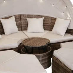 Toutes les caractéristiques du modéle – ici, le canapé de jardin rond en marron cappuchino: