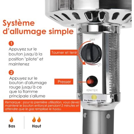 - 【Système simple d’utilisation】grâce au bouton de commande, vous pouvez régler la température, de basse à haute, en fonction de vos besoins. En outre, le système d’allumage simplifié vous permet de mettre le chauffage en route sans difficulté et de manière pratique en appuyant sur le bouton d’allumage rouge.