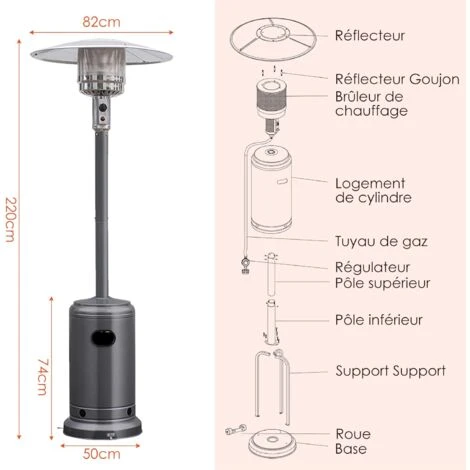- 【Facilité d’assemblage et de déplacement】2 poignées des deux côtés vous aident à installer le réservoir de gaz propane liquide de 9 kg (non inclus), sans effort. Les 2 roues fluides qui sont intégrées vous permettent de déplacer le parasol rapidement et sans effort.