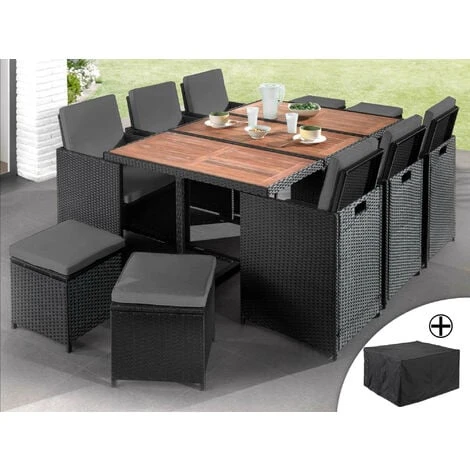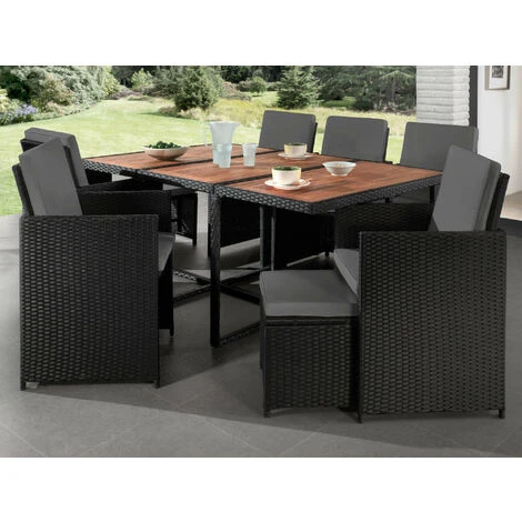 Le salon de jardin CUBA peut accueillir jusque 10 personnes lors de vos soirées d’été sur votre terrasse. Conçu en résine tressée de couleur noire, rappelant le rotin, votre salon de jardin arborera un design sobre mais tout aussi tendance. Les coussins de couleur gris viendront accentuer le style moderne de votre salon de jardin et se marieront parfaitement avec la couleur noire de la résine tressée. Grâce à son design, ce salon de jardin trouvera aussi bien sa place dans un jardin que dans un intérieur type véranda.