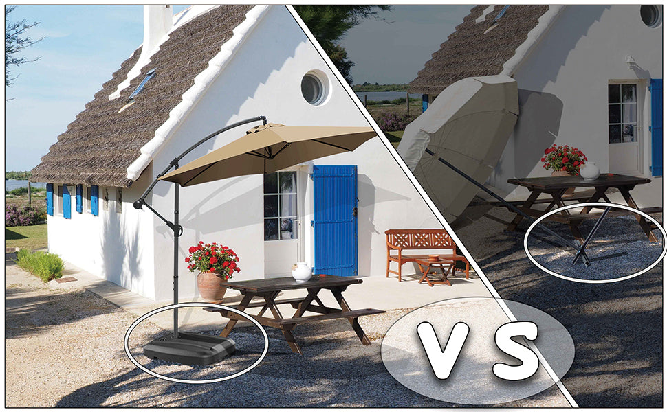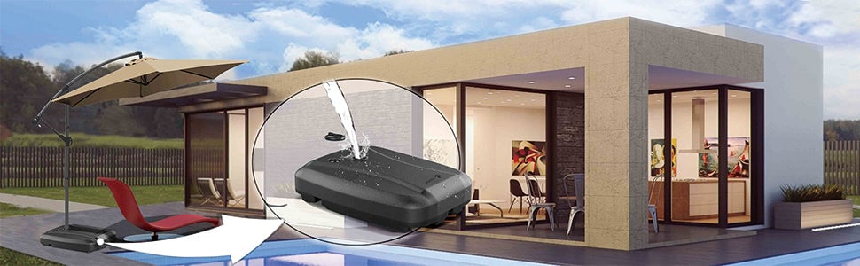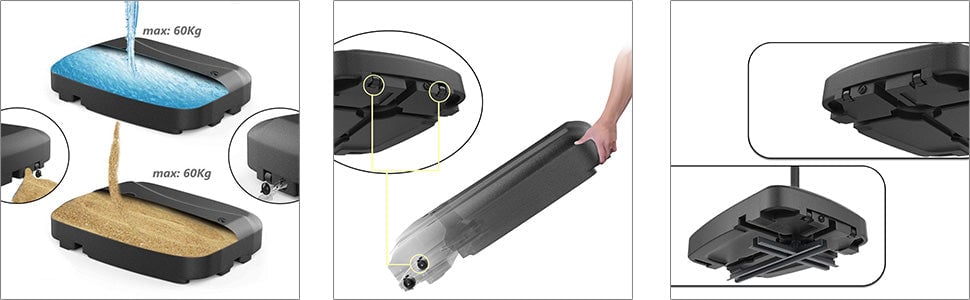 - Notre base de parasol se pèse seulement 7kg quand elle est vide. Vous pouvez facilement la mettre dans n’importe quel coin lorsque vous ne l’utilisez pas. Notre dalle est également équipée de roues et de poignées pour une manipulation facile lorsqu’elle est remplie d’eau ou de sable.