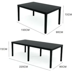 STRUCTURE ET UTILISATION – Table d’extérieur avec structure résistante en plastique renforcé – équipée d’une rallonge centrale de 70 cm et de 2 pieds supplémentaires qui garantissent sa stabilité – Produit avec une finition effet lattes, qui garantit confort et style – Produit parfait pour meubler avec élégance votre extérieur espace, jardin, balcon ou véranda – Produit polyvalent qui peut être combiné avec différents types de chaises, peut également être utilisé à l’intérieur – Produit peu encombrant idéal pour accueillir jusqu’à 10 personnes pour le déjeuner.