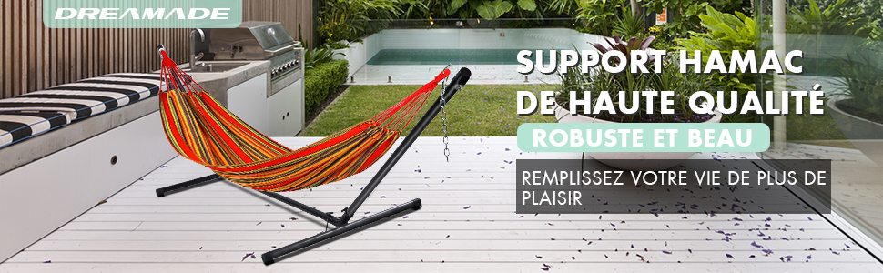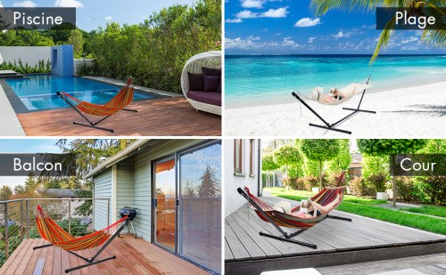 Si vous avez un hamac, comment pouvez-vous ne pas avoir un support de hamac ? Ce hamac a deux chaînes de suspension pour ajuster la heuteur comme vous voulez. Dispose des pieds antidérapants et des structures triangulaires assurent la stabilité et votre sécurité à la fois. Ce produit est idéal pour les activités à l’intérieur et à l’extérieur. N’hésitez pas !