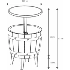 Table de jardin avec glacière et fonction chaise. Avec cette table en résine, vous aurez tout ce dont vous avez besoin pour vos fêtes au jardin. Il est très fonctionnel en offrant plusieurs options pour rendre vos apéros en plein air beaucoup plus agréables. C’est une table à 4 pattes qui imite un tonneau en bois avec un plateau rond qui s’élève de 25 cm au-dessus de sa hauteur fermée. C’est une excellente option si vous voulez mettre des snacks sur table et avoir des boissons dans la glacière avec des glaçons pour les garder au froid, sans ouvrir et fermer sans cesse. Mais ce n’est pas tout ! Vous pouvez utiliser la base dans son option repliée comme siège pour vos invités, car elle supporte 175 kg.nnFabriquée en résine robuste qui ressemble à des planches de bois beige avec protection contre les rayons UV pour l’extérieur. Doté d’une puissante isolation thermique qui garde les boissons froides pendant des heures. De plus, lorsque votre fête est terminée, vous pouvez la vider facilement grâce au bouchon de vidange inclus. Il suffit d’enlever l’eau et de la nettoyer avec un chiffon humide.nnPour relever le plateau supérieur, soulevez la base et repliez sa languette de sécurité pour éviter qu’elle ne s’abaisse. Créez un joli coin de détente sur votre terrasse, votre balcon ou votre jardin avec cette table d’appoint, facile à assembler et avec des matériaux recyclables qui s’adapteront à tous les styles. Cette table 3 en 1 un véritable success auprès de vos amis !nnCaractéristiques :n- Dimensions ouvertes : 48,5×48,5×82 cm.n- Dimensions fermée : 48,5×48,5×57 cm.n- Dimensions pattes : 16 cm.n- Matériau de la table et des pieds : Résine.n- Poids : 7,5 kg.n- Poids du siège supporté : 175 kg.n- Poids de la table : 35 kg.n- Capacité : 37 L.n- Intérieur et extérieur.n- Couleur : Beige.n- Montage facile.n- Protection contre les rayons UV : Oui.nn*Ne vous asseyez pas et ne grimpez pas sur la table dans son option élevée.