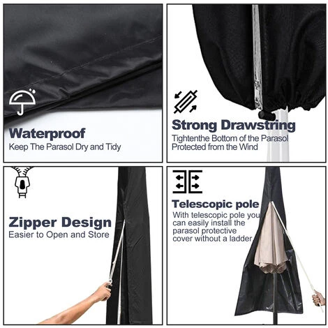 – Avec tige et fermeture éclair, pour une mise en place plus facile sur le parapluie debout