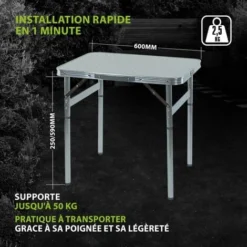 ★ Conception portable : la table peut être pliée et verrouillée avec une seule poignée. Les poignées sont en plastique robuste. Les poignées sont pliables. Il tient confortablement dans la main et est facile à transporter et à transporter. Lorsque la table n’est pas utilisée, elle est facile à installer et à plier. La conception légère économise de l’espace, est durable et compacte.