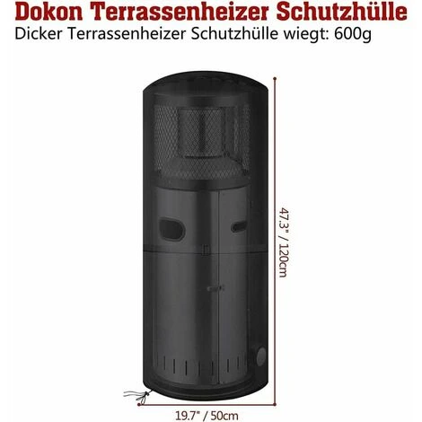 Dimensions : 50 cm de diamètre x 120 cm de hauteur est la taille disponible de la housse de protection du radiateur. Vérifiez votre chauffe-terrasse pour trouver la bonne taille. La housse s’adapte à la plupart des chauffe-terrasses ronds.