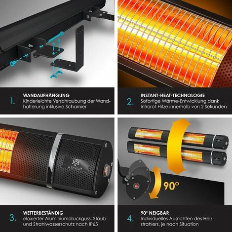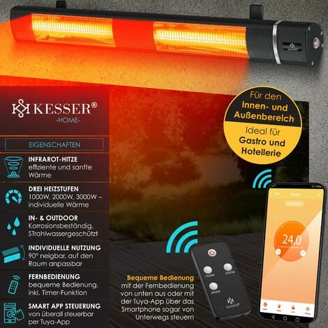 KESSER Chauffage infrarouge avec 3 réglages de chaleur pour répondre à un besoin de chaleur individuel et réaliser des économies d’énergie, grande précision de l’émission de chaleur, facile à fixer au mur avec les vis et chevilles fournies