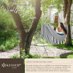 Notre chaise longue suspendue s’adapte parfaitement à votre morphologie et renforce les muscles de votre dos et votre sens de l’équilibre : balancez-vous pour une meilleure forme physique ! Avec 150 cm de large, il est assez large pour deux personnes, ce qui permet à plusieurs personnes d’y prendre place confortablement et en toute sécurité. Grande surface de couchage : Avec son design intemporel et élégant, le hamac s’intègre parfaitement dans votre jardin, jardin d’hiver ou sur votre terrasse et balcon, et bien sûr aussi avec vos meubles de jardin et décorations d’extérieur. Que ce soit à l’intérieur ou à l’extérieur, avec le hamac de KESSER modulable, vous êtes parfaitement équipé pour toutes les situations. Oubliez le stress du quotidien et détendez-vous avec la chaise suspendue KESSER !