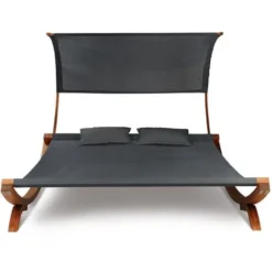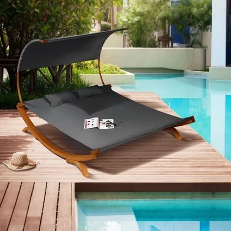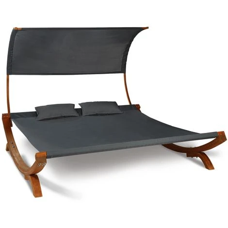 Seul ou à deux, profitez d’un instant de détente sur ce lit de jardin double place. Confortablement installés, vous serez portés par ses formes arrondies et sa structure robuste. Avec son design naturel et moderne, le lit de jardin sur pieds s’accordera à merveille avec votre mobilier extérieur. Le lit de jardin avec auvent est conçu pour accueillir deux personnes. Avec sa toile 100% polyester de 200 cm x 180 cm, le hamac sur pieds offre de belles dimensions ainsi que 2 oreillers de 25 x 55 cm pour un confort optimal. Partagez ainsi un moment convivial dans votre jardin ou sur votre terrasse en toute tranquillité. Ne vous souciez plus des rayons du soleil ; grâce à son auvent de 180 cm x 65 cm, vous serez protégés ! Fabriqué avec des matériaux de qualité, le lit de jardin en bois gris anthracite est robuste et peut soutenir jusqu’à 200 kg. Grâce à ses 4 pieds de 15 cm de hauteur, vous serez surélevés pour encore plus de confort. La structure du lit de jardin, en bois de mélèze vernis, ainsi que la toile grise 100% polyester de 580 gr confirment sa robustesse et lui permettent de durer dans le temps. Ses couleurs naturelles et son design moderne font de ce lit de jardin un élément indispensable à votre extérieur. Parfait pour un moment de tranquillité seul ou à deux, profitez du confort de ce lit de jardin ultra design et contemporain, idéal dans votre jardin !Dimensions du lit de jardin gris anthracite avec auvent – Dimensions totales : Longueur 200 CM x largeur 200 CM x Hauteur 160 CM- Matériaux : bois de mélèze vernis- Toiles et coussins 100% polyester- Dimensions de la toile de couchage : 200 x 180 CM- Dimensions du auvent : 180 x 65 CM- Hauteur des pieds : 15 CM- Dimensions des oreillers (non déhoussables) : 22 x 55 CM- Capacité maximale : 200 kg- Dimensions du bois (arceaux) : 8 x 6 CM- Dimensions du bois (transversal) : 7 x 4 CM- Dimensions du bois (auvent) : 3 x 3 CM- Dimensions du bois (pieds) : 7 x 5 CMCe modèle existe dans plusieurs coloris :- Lit de jardin en bois avec toile écrue et auvent- Lit de jardin en bois avec toile noire et auventRetrouvez également tous nos bains de soleil disponibles sur notre boutique en ligne ! – HORS CORSE -article non livrable en Corse