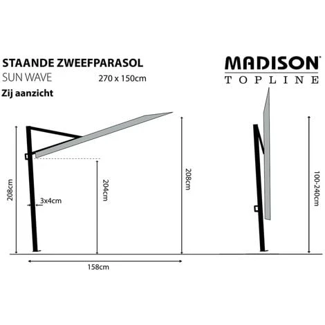Veuillez noter que ce parasol a besoin d’un pied de parasol d’un minimum de 30 kg ou d’un support de balcon Madison (non inclus). Le parasol Sun Wave est mieux protégé avec une housse de parasol Madison vendue séparément dans notre assortiment.