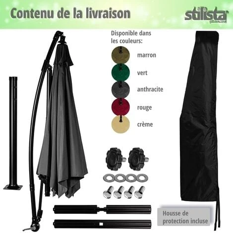 Le beau et pratique parasol STILISTA de 350 cm est doté d’une toile en polyester de 180 g/m². Notre parasol ombrageant est doté d’une structure stable en acier revêtu par poudre. En outre, le parasol de jardin possède 24 LED pour une lumière agréable le soir, l’éclairage est alimenté par un panneau solaire intégré. Le parasol présente de nombreux points forts, comme une manivelle pratique pour l’ouverture et la fermeture et un pied en croix pour une bonne stabilité. Nous proposons notre parasol de terrasse en cinq couleurs : crème, marron, vert, rouge et anthracite. Contenu de la livraison: 1x Parapluie 1x matériel de montage 1x housse de protection pour parasol 1x notice de montage