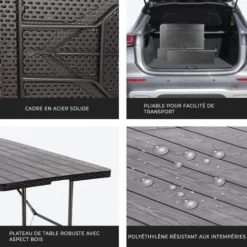 La table pliante a un aspect bois et peut être utilisée à l’intérieur comme à l’extérieur.