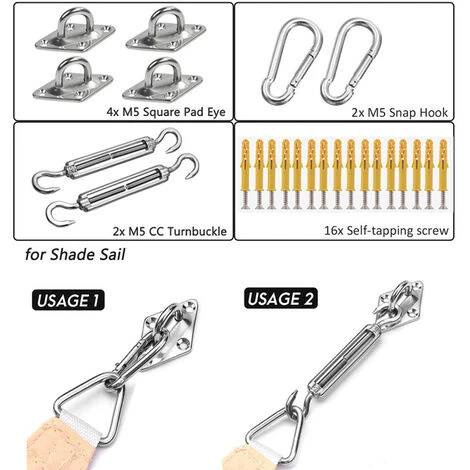 SPECIFICATION:Material : 185GSM Polyester Oxford FabricShape :Square / Rectangle /TriangleSize of Ropes : L=2.5m, D=3.5mmMaterial of Ropes : NylonSize of D-Rings : M5 (D=5mm)Material of D-Rings : 304 Stainless SteelPACKAGE INDLUDESquare / Rectangle ShapeIncluded:1*Shade Sail, 4*Ropes,